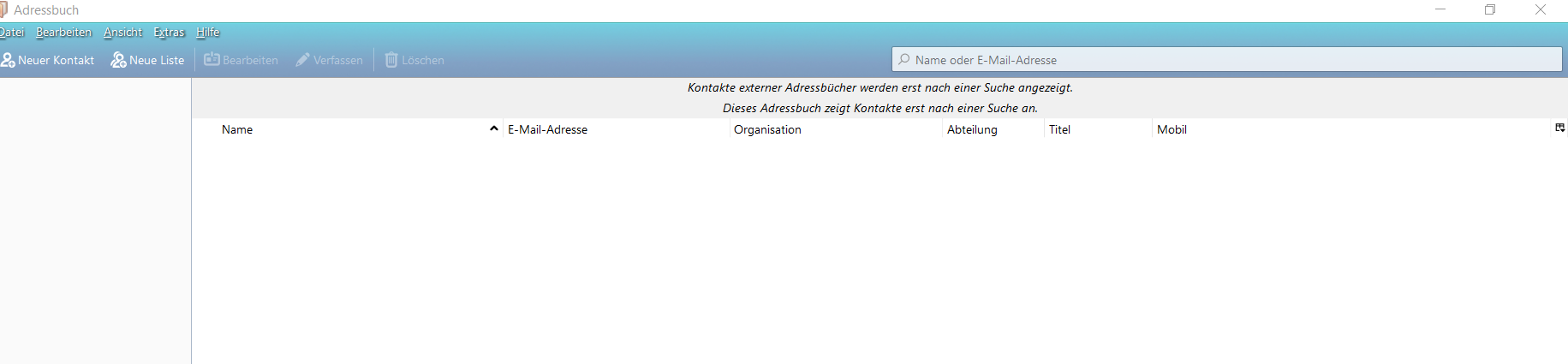 Nach dem Upgrade auf TB 78.5.1 finde ich unter Adressbuch nur die Hinweise, dass Adressen erst nach der Suche angezeigt werden. Nach Eingabe eines Namens in die Suchleiste kommt trotzdem kein Ergebnis, egal welche in den verschiedenen Foren und/oder Hilfeseiten angebotenen Tastenkombinationen ich verwende.