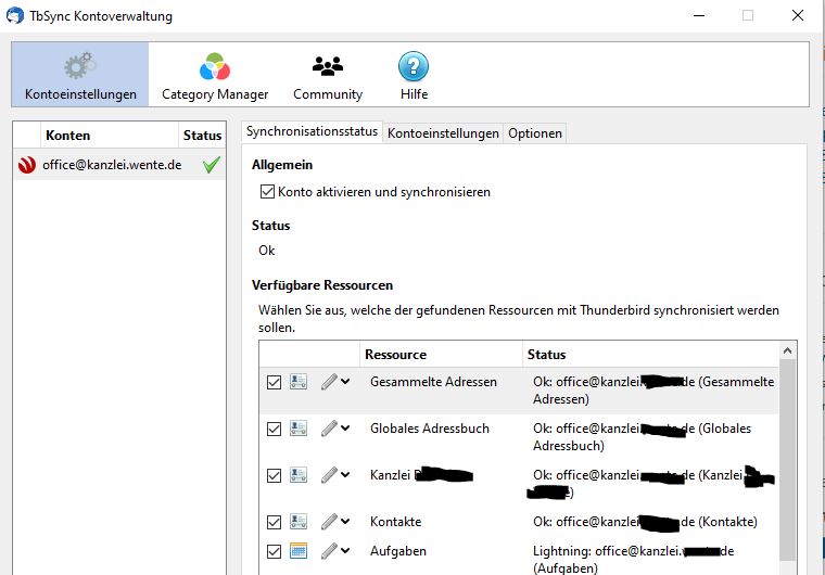 Im TbSync sind die richtigen Kontoeinstellungen für CaldAV und CardDAV eingetragen. Unter Resourcen werden 4 Adressbücher angezeigt
