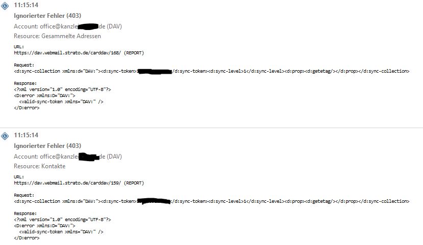 Bei Synchronisation werden für "Gesammelte Adressen" und "Kontakte" ignorierte Fehler (403) angezeigt, vermtlich, weil sie leer sind.