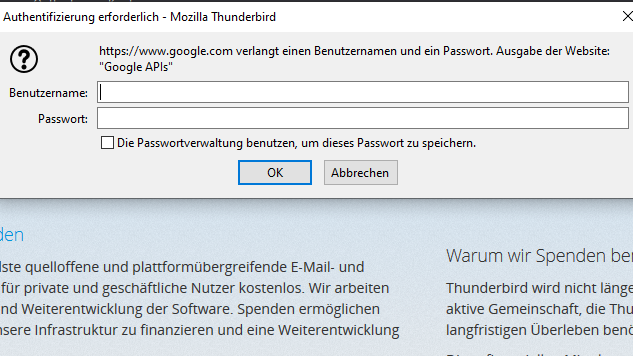 ich hoffe ihr könnt mir vielleicht helfen. Ich habe mir heute seit langer langer Zeit mal wieder die aktuelle Thunderbirdversion geladen. Soweit hat alles gut geklappt, allerdings bekomme ich bei jedem Start von Thunderbird eine Meldung, dass ich mein Googlename und Passwort eingeben soll. Ich hatte vor rund 5 Jahren mal Thunderbird testweise installiert und darüber meine Googlemail empfangen. Ich habe damals alles komplett deinstalliert usw. Ich habe mal einen Screenshot angehangen. Was kann ich weiter machen, dass diese Meldung verschwindet ? So nervt es tierisch...