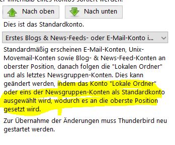 Die fehlende Sortiermöglichkeit der Mailkonten bei IMAP-Nutzung scheint noch eine Schwäche zu sein. In der "about:config" gibt es zwar die Einstellung "mail.accountmanager.accounts", aber dort sind nur 5 Accounts mit Nummern dahinter aufgeführt, obwohl ich jetzt 11 Mailkonten abrufe, wovon 10 über "Lokale Ordner" verwaltet werden.