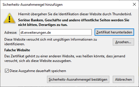 Ich benutze kein Drittanbieter-Antivirenprogramm und die Windows eigene Firewall. Ein Update auf die neueste Version von TB hat nichts gebracht. Ich möchte das Zertifikat selbstredend nicht herunterladen ohne zu wissen, worum es sich handelt. Ferner möchte ich diese Ausnahme auch nicht dauerhaft speichern. Die Einstellungen meines Rechners haben sich seit Monaten nicht verändert, die Meldung erscheint also ohne für mich nachvollziehbaren Grund. Ich habe TB parallel auf einer Linux-Mint Installation laufen. Hier kommt es nicht zu dieser Meldung. nicht.