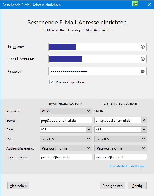 Vodafone verlangt nach der Migration für Pop3 die Server-Einstellung