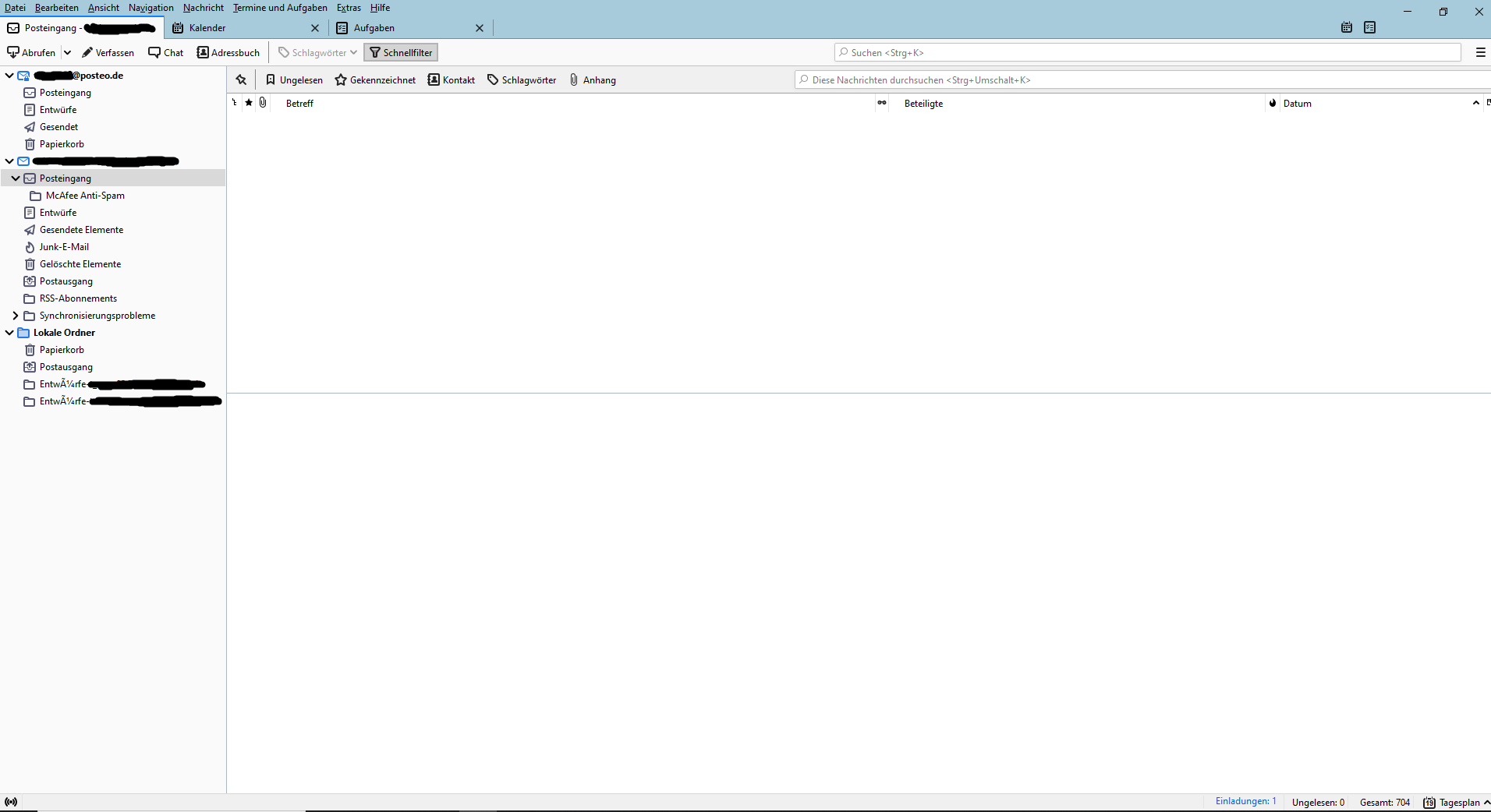 ich nutze Thunderbird Version 78.6.1 auf Windows 10 (64bit). I habe zwei Email-Adressen angemeldet - eine über Posteo und die andere über die Universität, an der ich arbeite. Bei letzterer Adresse habe ich seit gestern das Problem, dass nach einiger Zeit die Email-Liste im Posteingang verschwindet und dieser als leer angezeigt wird. Die Emails sind aber noch da. Wenn ich den Posteingang verlasse und diesen dann wieder öffne, werden sie wieder angezeigt. Nach einiger Zeit verschwinden sie dann einfach wieder (ohne, dass ich etwas anklicke etc.). Das sieht dann aus wie im angehängten Foto. Meines Wissens nach wurde kein Update installiert, das den Fehler ausgelöst haben könnte.