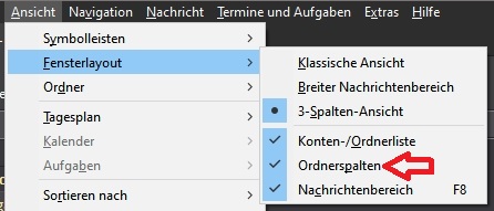 Die Ordner-Übersicht (links) zeigt vorhandene E-Mails (egal ob ungelesene uder gelesene) nicht an.
