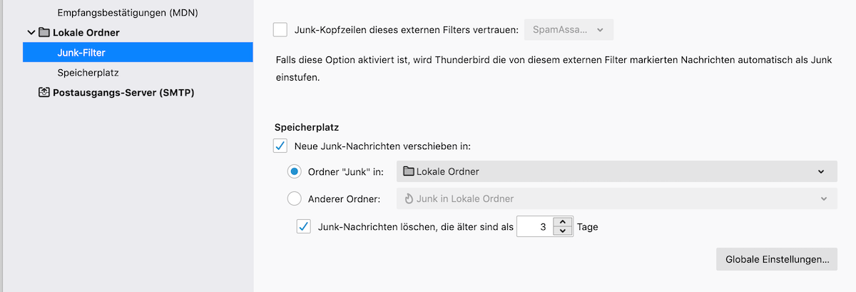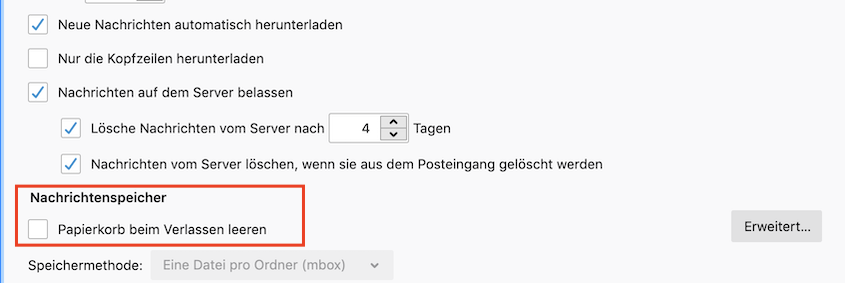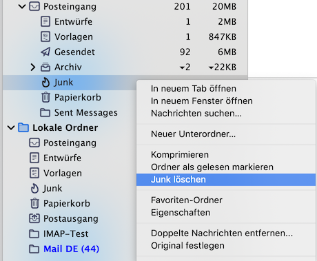 ich lasse mir meine 9 Mailkonten gruppiert anzeigen. Gibt es eine Möglichkeit, den Junk-Ordner auf einen Rutsch zu leeren, so wie man das mit dem Papierkorb machen kann? Z.Zt. muß ich alle Mailkontos nacheinander anwählen, alle Inhalte markieren und dann eben löschen. Sehr umständlich...
