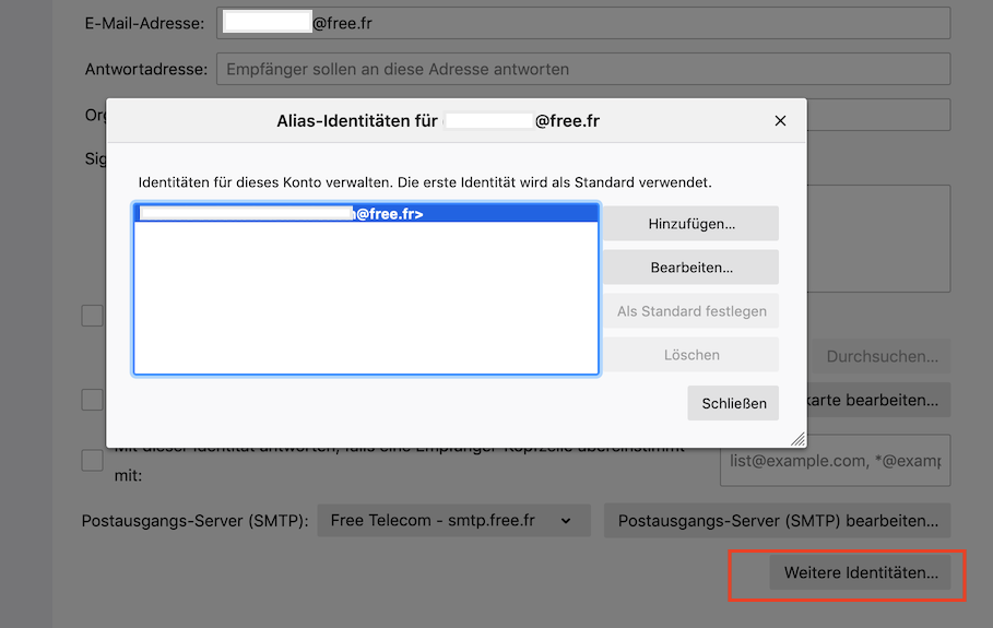 Klicke unten rechts auf "Weitere Identitäten" und teile uns mit ob Aliase für dieses Konto erstellt wurden.