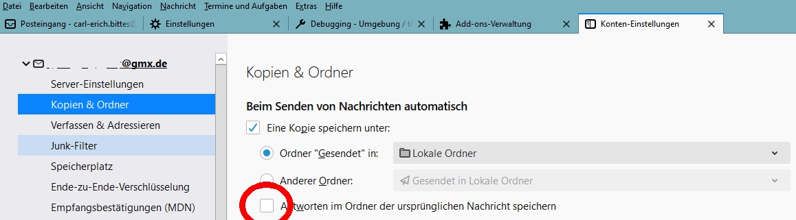 Wie und wo kann ich einrichten, dass meine Antworten auf Mail in einem Ordner in diesem Ordner gesichert werden und nicht im Ordner Gesendet - am besten generell für alles Ordner?