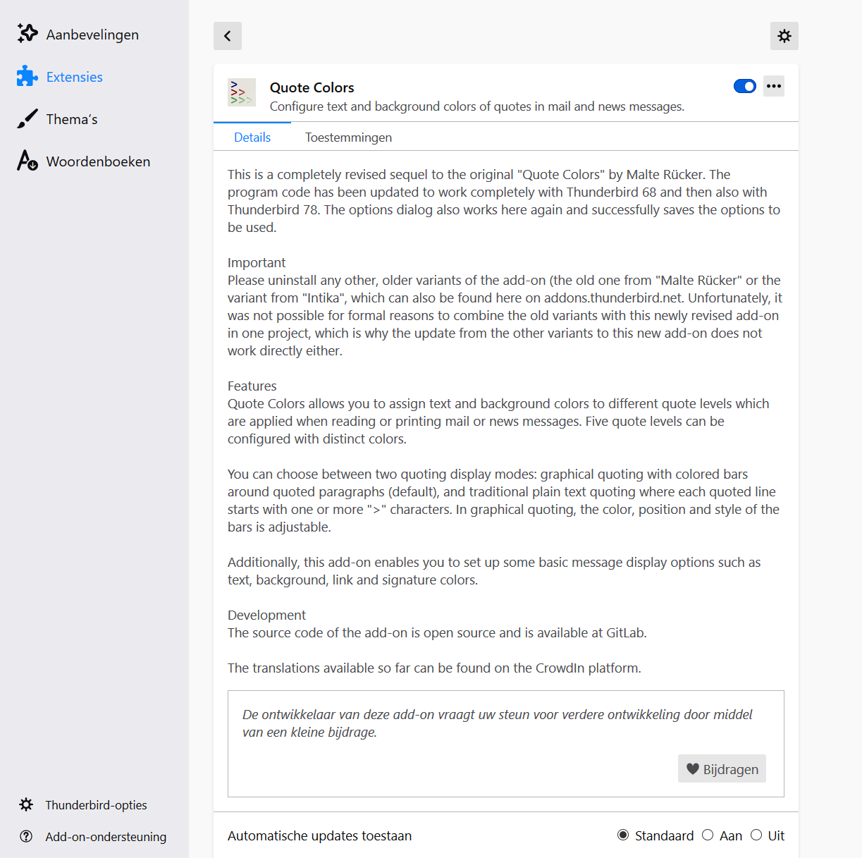 Hi, I'm a new Thunderbird user and would like to use this add-on. I installed the add-on and it shows up in my list of add-ons. However, I cannot find the location where I can actually use Quote Colors, and create text and background color settings. See the image below. Where are the settings? My version of Thunderbird is in Dutch.