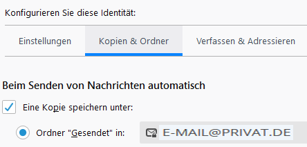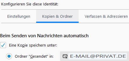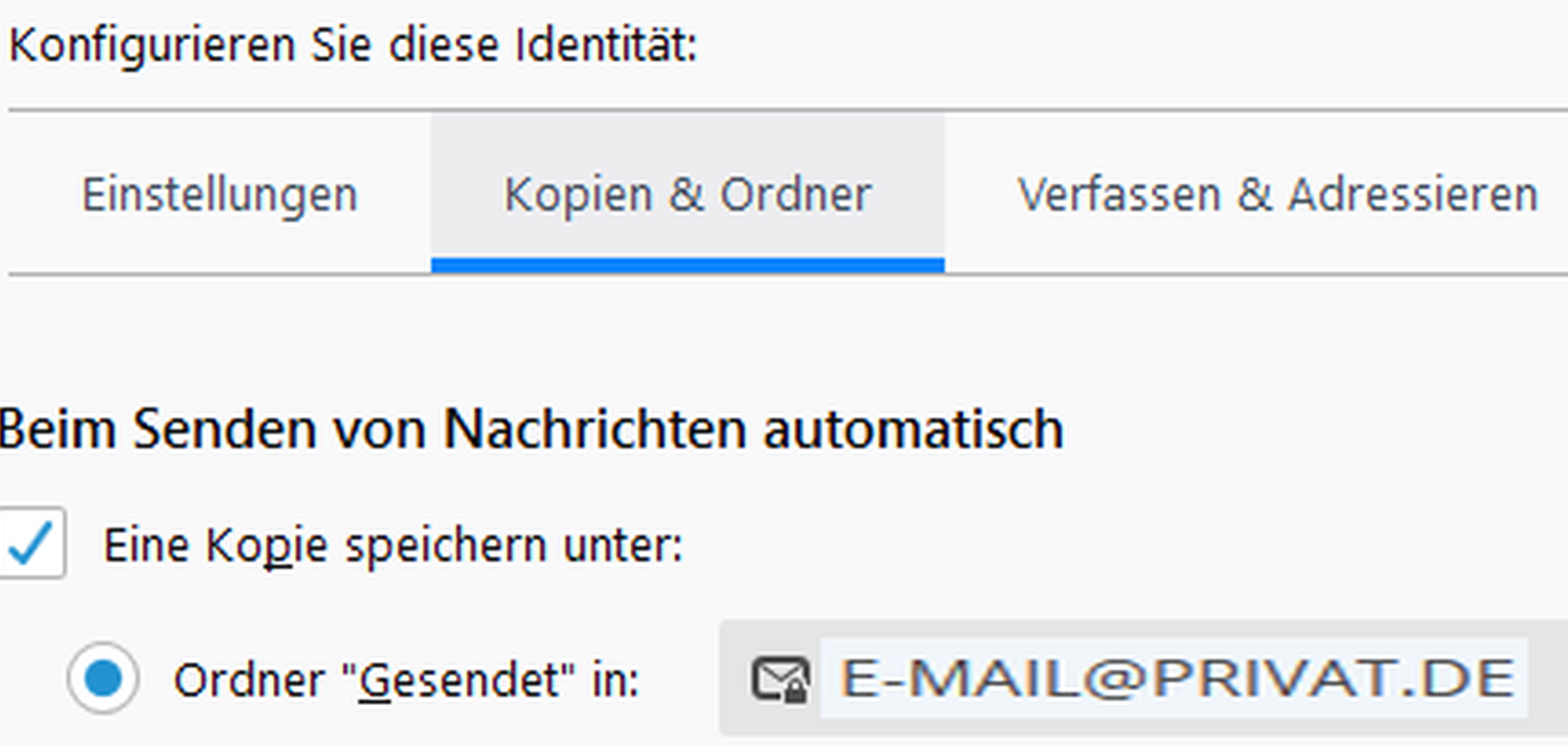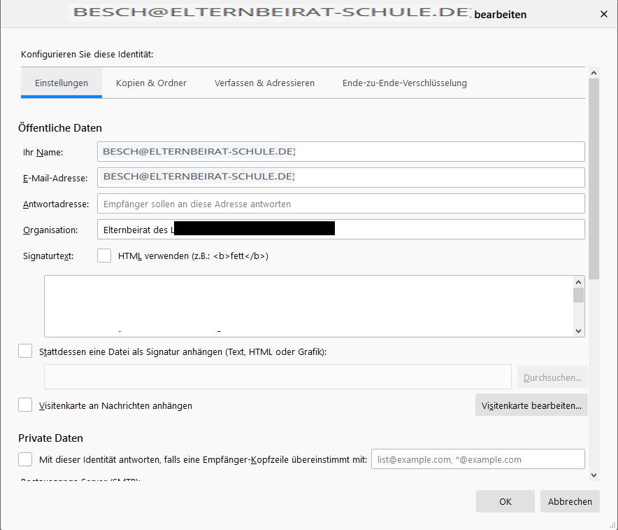 Konto-Einstellungen -> Konto E-MAIL@PRIVAT.DE -> Weitere Identitäten -> die BESCH@ELTERNBEIRAT-SCHULE.DE als weitere ALIAS-Adresse erfasst: