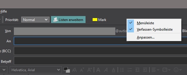 Hier fehlt mit einem Mal die Menüleiste und der Butto "SENDEN", auch die linke Spalte mit meinen Adressen aus dem Adressbuch fehlt.