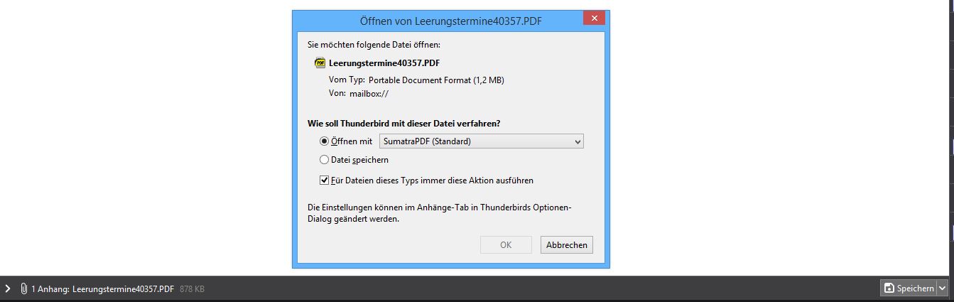 Ich suche verzweifelt nach einer Möglichkeit, in Thunderbird den PDF-Reader zu konfigurieren, mit dem Thunderbird eine im Anhang angefügte PDF-Datei öffenen soll.