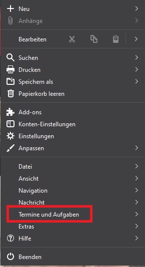 Im Menü (Extras) kann ich auch nicht die übliche Option "Termine und Aufgaben" finden. Was muss ich hier tun?