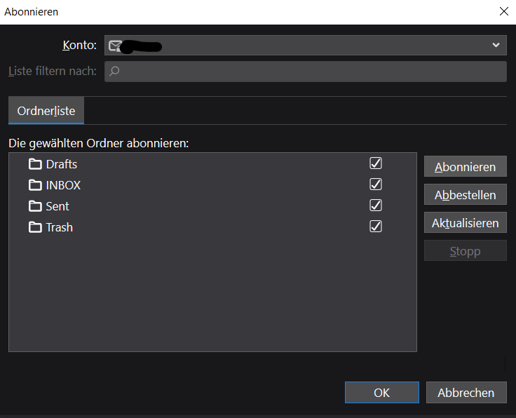Hauptansicht ->mit rechter Maustaste auf`s Konto -> abonnieren -> im folgenden Fenster den Haken beim betreffenden Ordner entfernen (Dauert u.U ein bisserl bis der weg ist) oder Ordner markieren und auf abbestellen klicken.