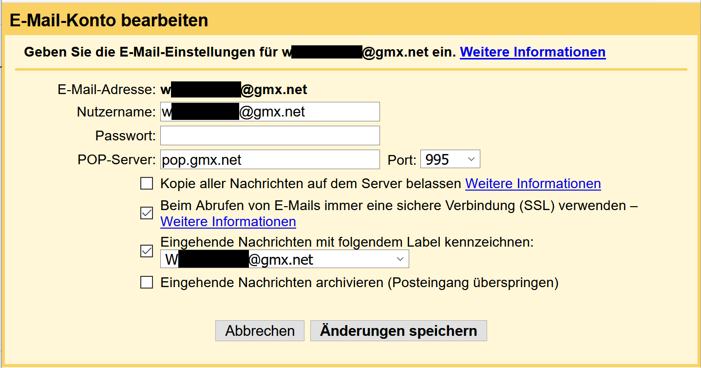 • Postfach-Anbieter (z.B. GMX): Gmail und senden über GMX