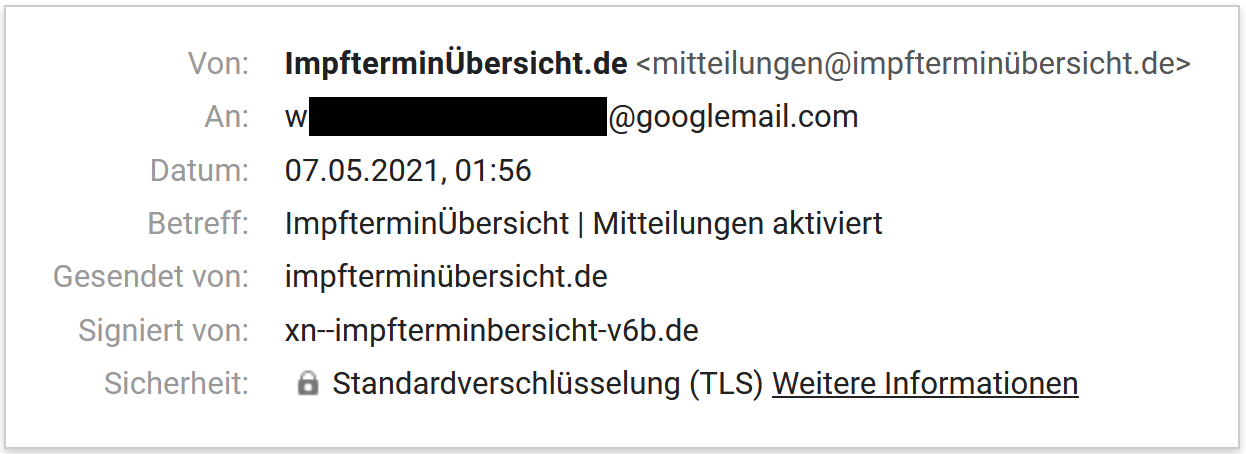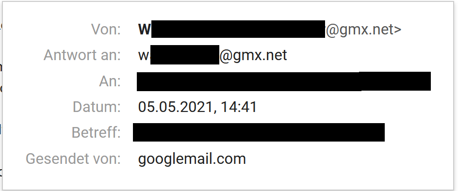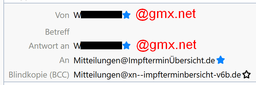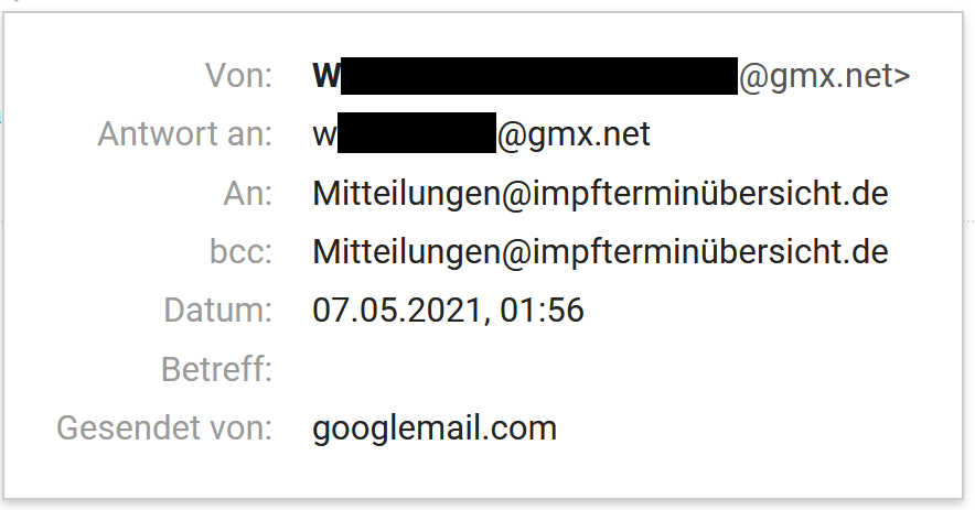 • Beispiel 1: Eine E-Mail mit Thunderbird von GMX an mitteilungen@impfterminübersicht.de gesendet, hier ging die Antwort an Gmail statt GMX.