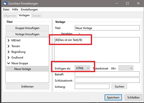 ist es möglich den Text in Quicktext zu formatieren (unterstreichen,Fettschrift,)?