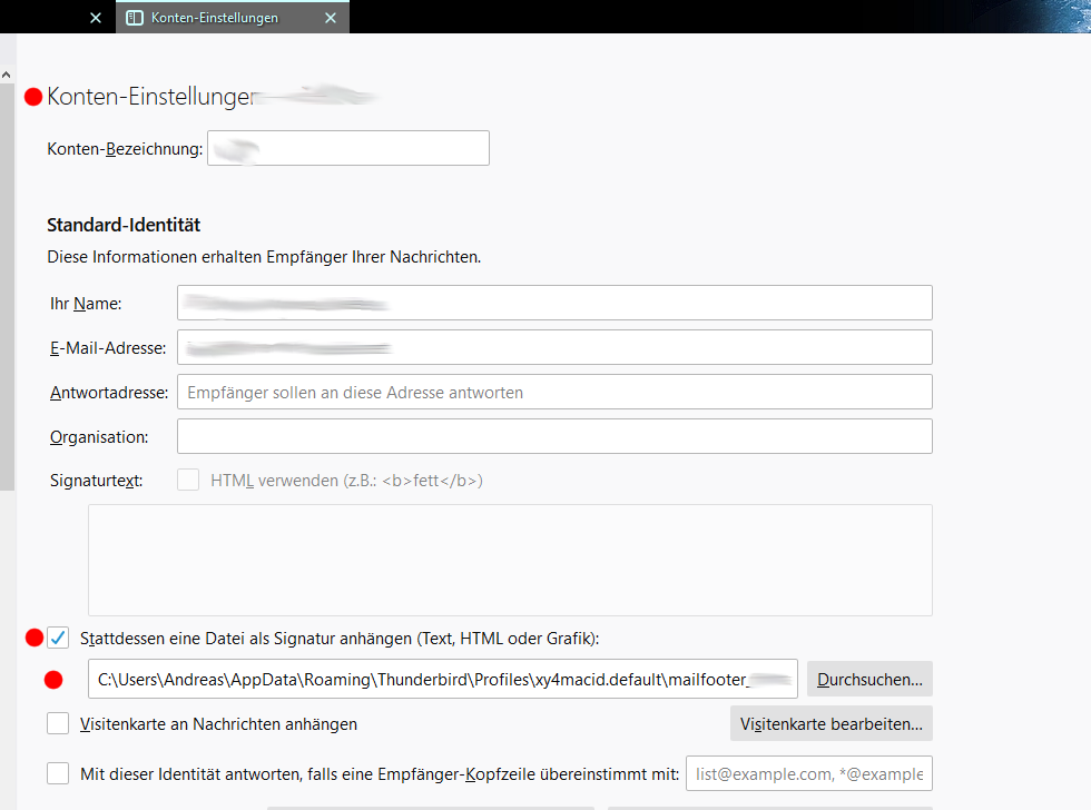 Ich bin Neuling mit Thunderbird und versuche verzweifelt, (wie das bei Outlook ganz einfach einzustellen ging) eine abgespeicherte html Signatur mit Bild (Logo) und Links zu Email und Webseite automatisch jedes Mal unter die Mails zu bekommen- unterschiedlich je nach Mailkonto. Bisher bin ich gescheitert.... X/