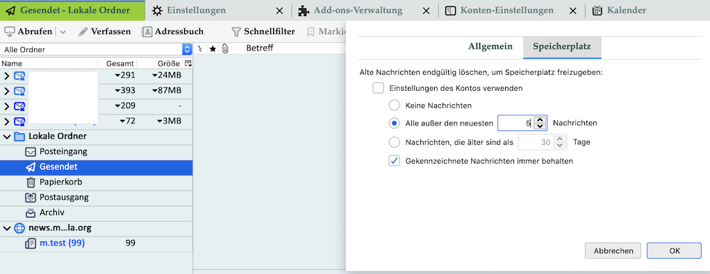 Ich bekomme jedes Monat von meinen Provider die Rechnung per Email und verschiebe diese mit einer Regel in einen eigenen Ordner. Jedoch haben sich inzwischen unzählige Rechnungen angehäuft die auch manuel löschen kann immer aber wäre es möglich das in einen Ordner immer nur die letzten 5 Rechnungen bleiben und alle anderen dann automatisch gelöscht werden?