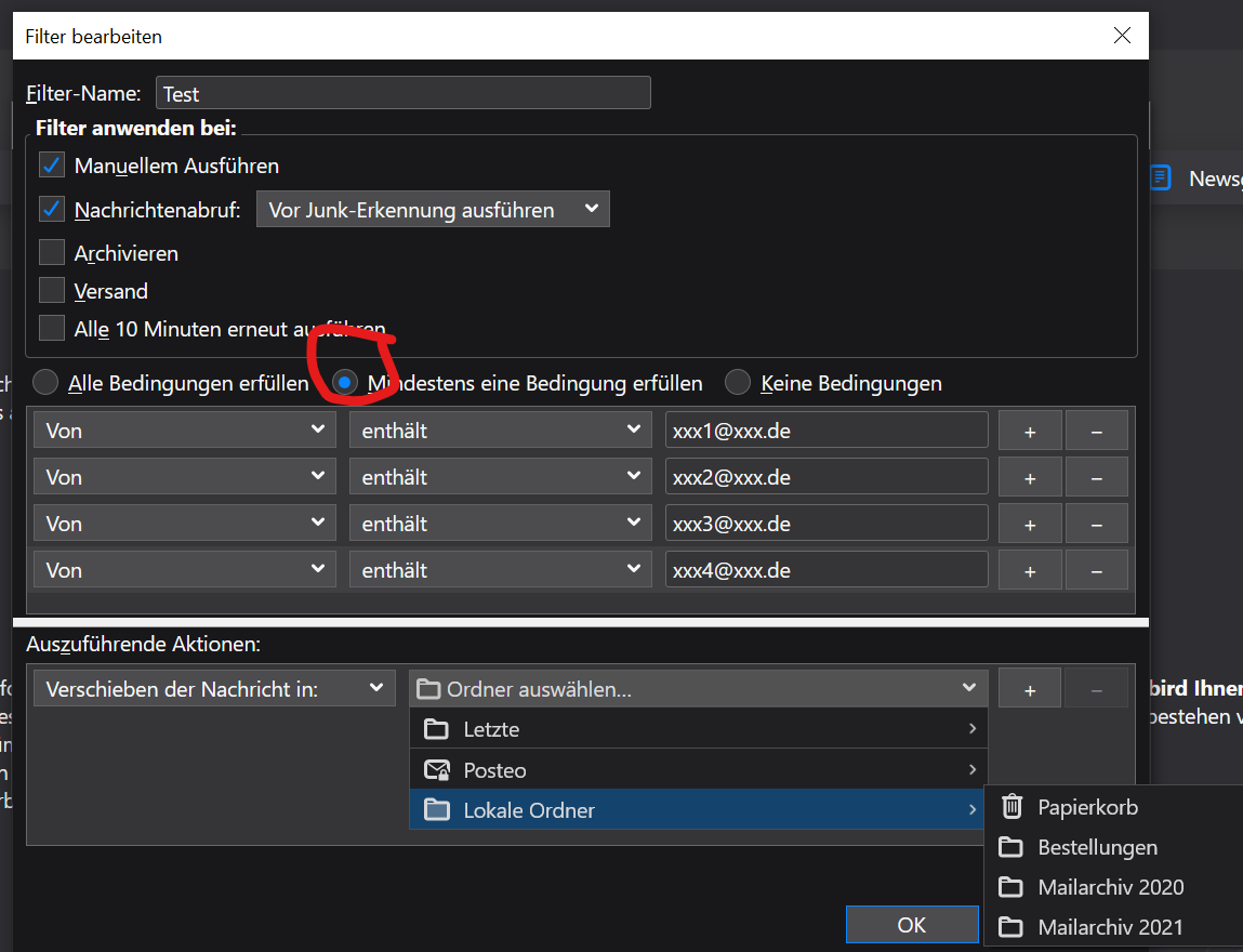 Wie kriege ich es hin, dass alle E-Mails dieser 4 Personen in den gleichen lokalen Ordner, den ich erstellt habe, automatisch verschoben werden. Oder muss ich für jede dieser 4 Personen eigene Filternnamen erstellen und dann in den selbigen lokal erstellten Ordner verschieben lassen? Ich habe es mit einem Filternamen versucht und die Filterregeln "von" u. "ist" benutzt. in das letzter leere Feld neben den Rgelen auf der rechten Seite habe ich dann die E-Mail Adressen eingetragen. Aber das klappt leider nicht.