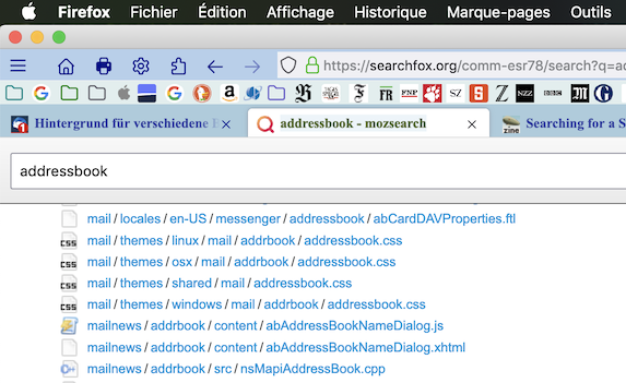1) eine Suche auf https://searchfox.org/ z. B. nach addressbook ergibt