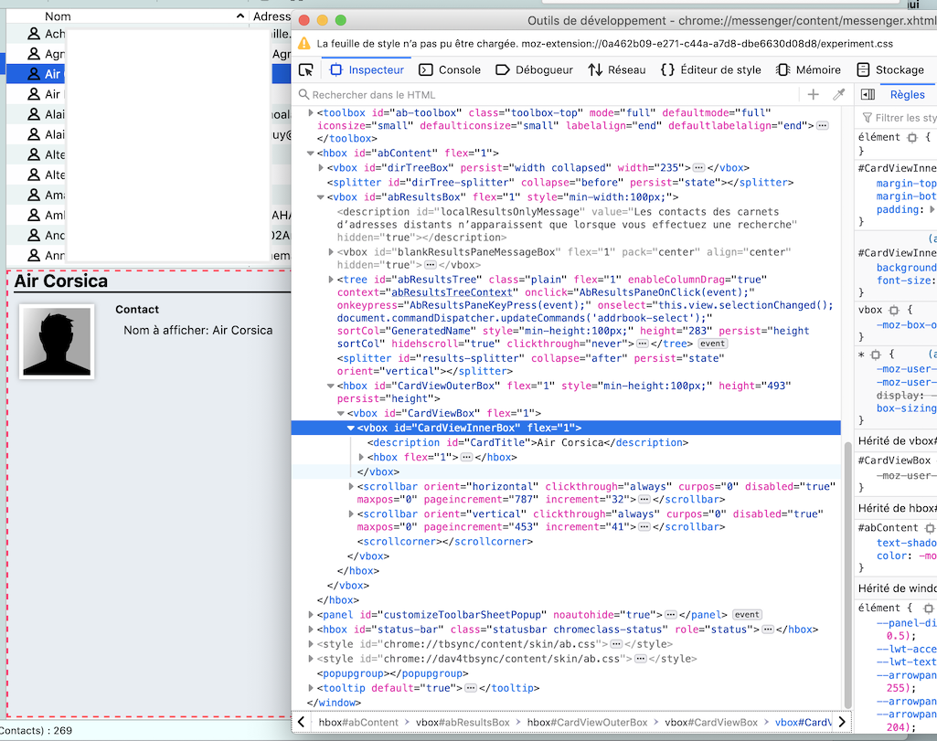 Mein Code in der userChrome.css Datei für den Kontaktbereich im Adressbuch lautet