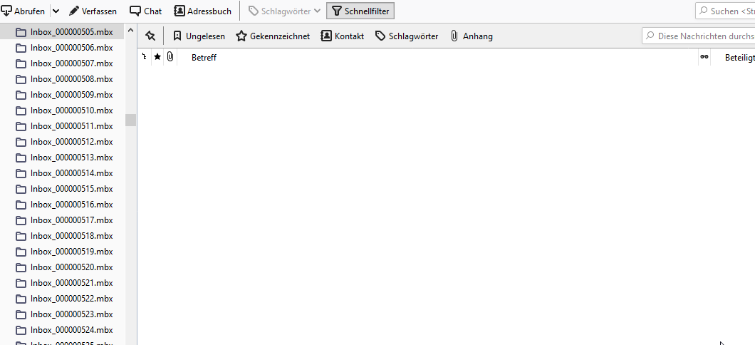 Das Mailboxfile wird auch korrekt mit ca. 500MByte angezeigt. Fehlerhafterweise zeigt sie aber nur 4 Messages an. Das macht TB auch. Er zeigt nur die neuesten 4 Messages an. Die anderen 6000 Messages werden nicht angezeigt, müssen aber noch da sein (sonst wäre das Inbox File nicht so groß).