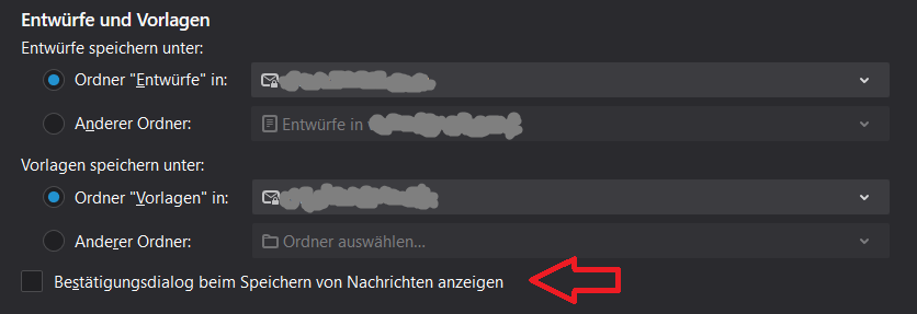 dieser Nachfrage-Dialog beim Speichern könnte hierher kommen (Konteneinstellungen > Kopien & Ordner > Entwürfe und Vorlagen):