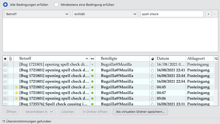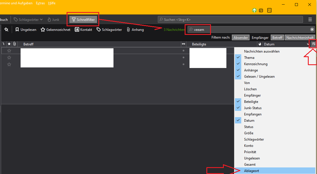 Da ich die emails nirgendwo mehr finde, habe ich auf der Ebene "Konto" eine Suche auf einen der Absender getätigt ... siehe da - es werden die richtgen Email Auszüge angezeigt, samt der Info auf Anhänge - kann aber nichts damit anfangen. Kein Hinweis wo die gespeichert sind, noch kann ich die email(s) aufrufen.