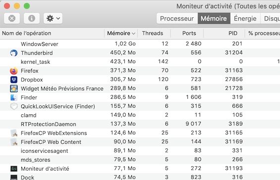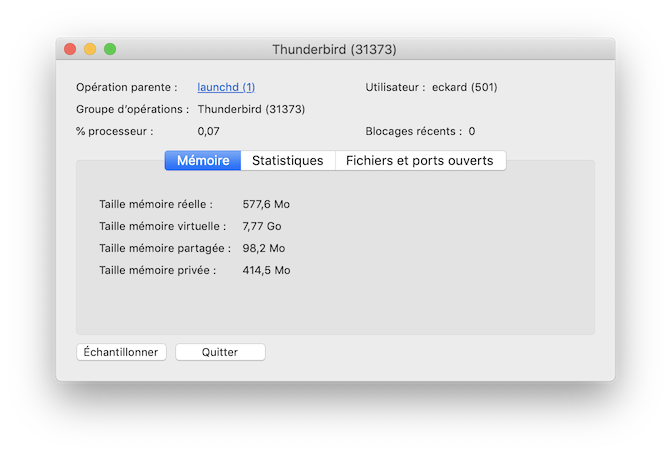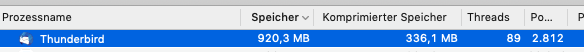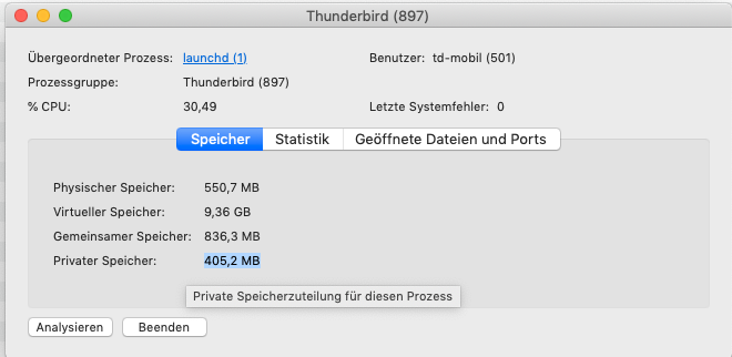 Deine %CPU ist schon recht hoch, es sei denn TB ist gerade mit irgend welchen Aufgaben beschäftigt. Bei mir ist er hier im Ruhezustand. Ob TB mit etwas beschäftigt ist, kannst du u. U. in Extras > Aktivitäten sehen.