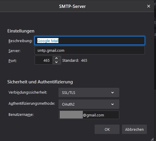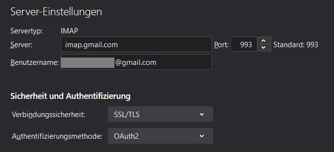 Beim Kontoeinrichten zeigt TB zunächst (grün) an, dass meine Einstellungen gefunden wurden (*@.gmail.com). Nach der notwendigen Synchronisierung mit Google wird mir gemeldet: "Anmeldung auf dem Ser5ver fehlgeschlagen." Ich habe es mit TN 78 und 91 versucht, gleiches Ergebnis!