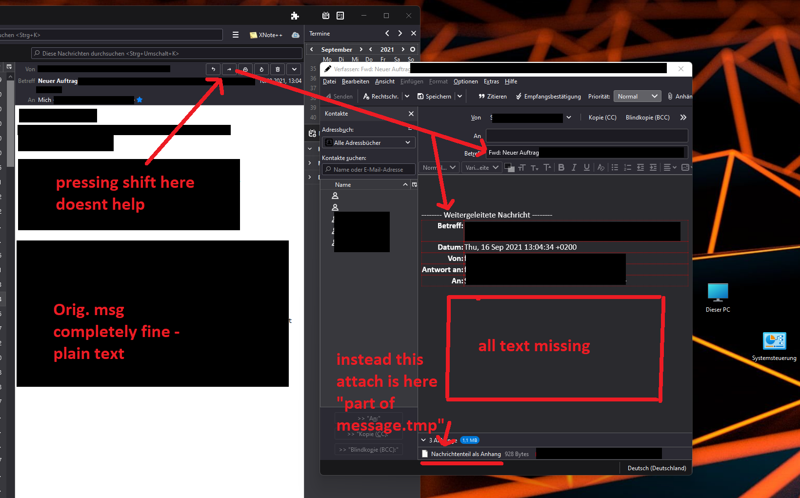 Natürlich habe ich in den Einstellungen beim weiterleiten angegeben, dass die Nachricht "eingebunden" sein soll und ich habe alle settings die mit mit HTML/plain-text zutun haben mehrfach durchprobiert (schon Stunden lang). Auch langes langes googlen hat mir nicht geholfen obwohl ich eigentlich Profi im Problemlösen bin..