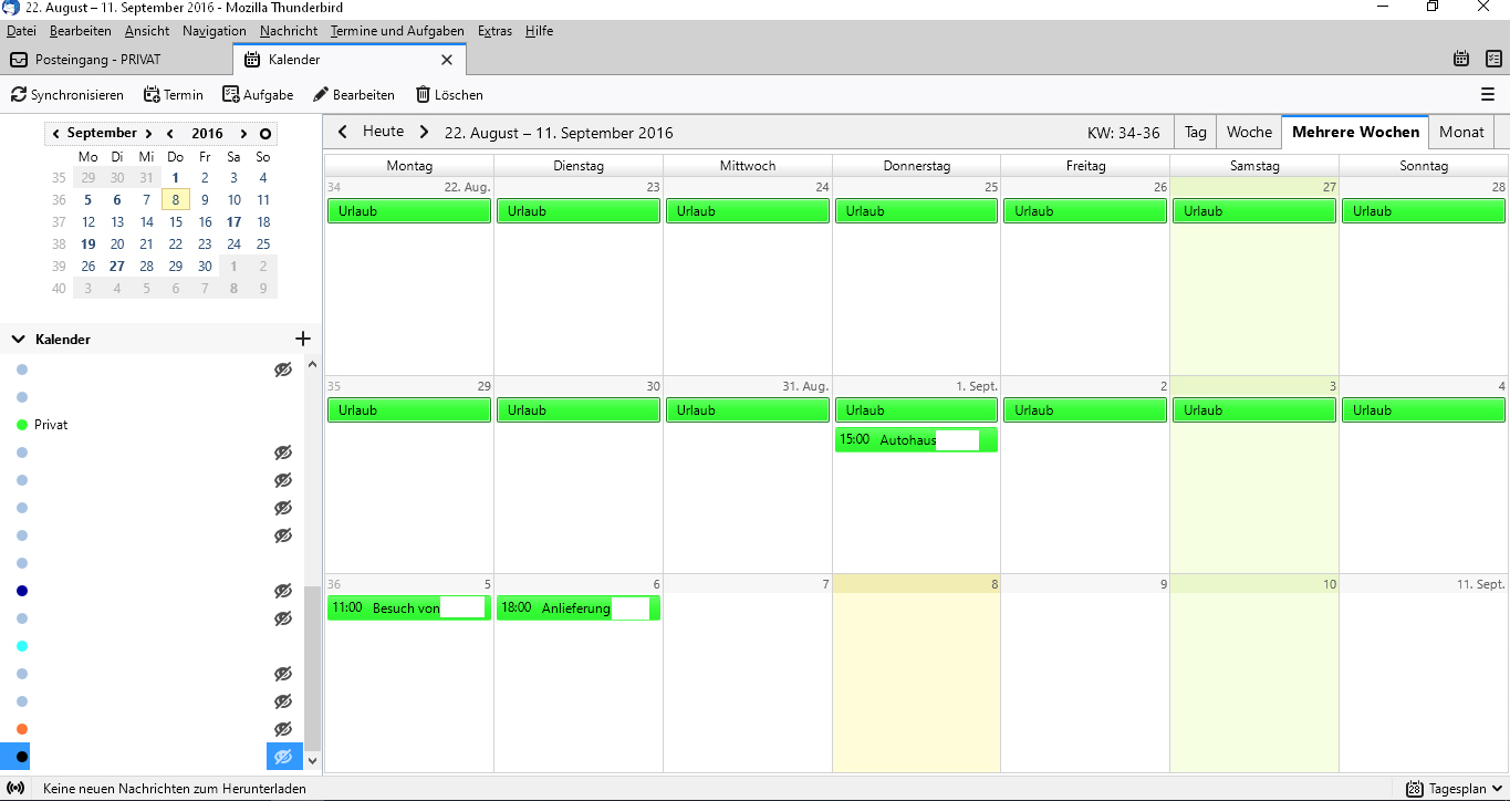 - Manche Kalendereinträge werden nur teilweise bzw. bruchstückhaft synchronisiert. (siehe unten mein Privatkalender). (Hinweis: Der "Urlaub" ist für jeden Tag als Einzeltermin eingetragen.)