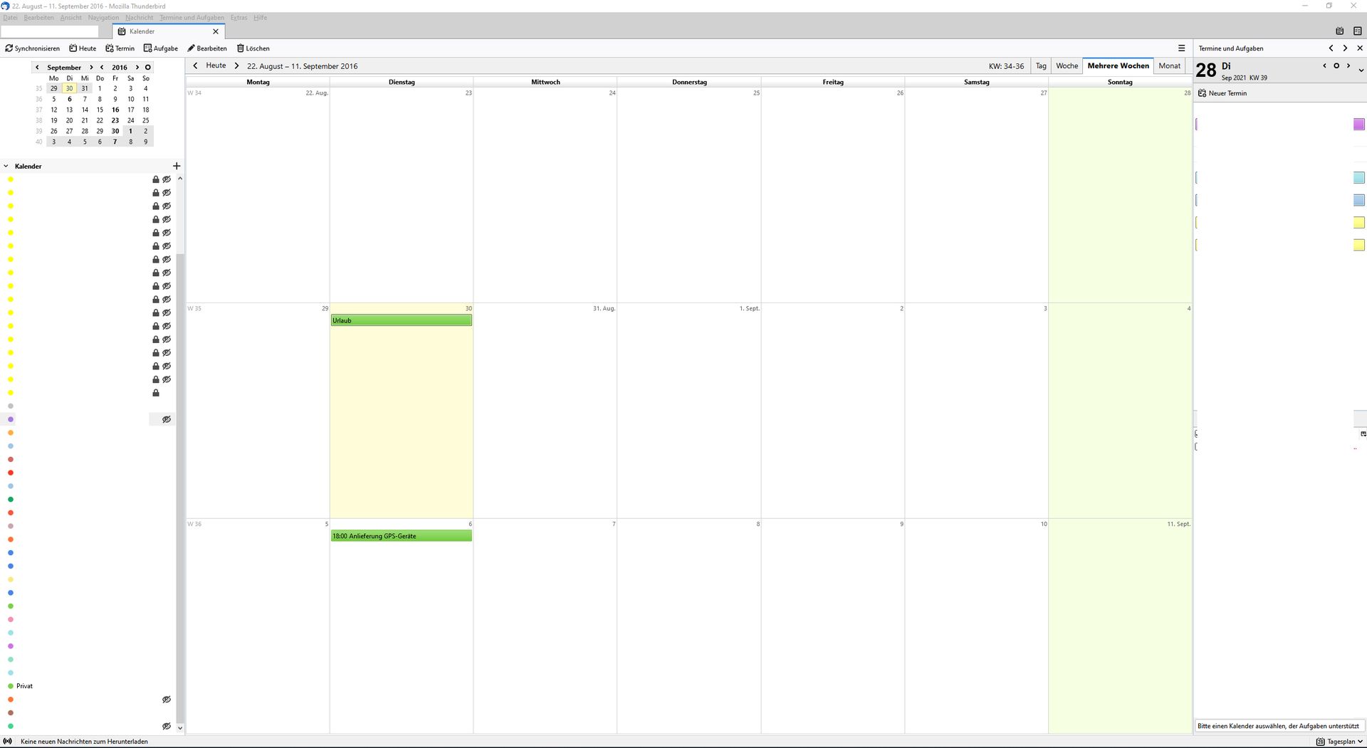 Die zwei Bilder unten zeigen eine Stelle, an der der "Privat"-Kalender nur teilweise synchronisiert wird. Die Termine sind schon etwas älter (von 2016), aber an dieser Stelle scheint eine "Abbruchstelle" für die Synchronisation zu sein. Alle weiteren Termine aus dem Google-Kalender "Privat" erscheinen dann nicht mehr. In Thunderbird 78.14.0 habe ich dieses Problem nicht (da läuft es über das Addon "Provider für Google Kalender"). Da ist alles in Ordnung.