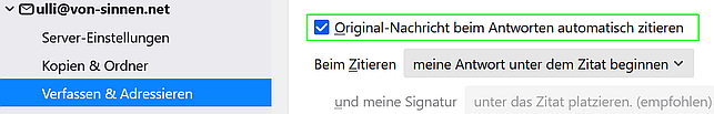 nach dem (langerwarteten) update auf 91.2.1 fällt mir zunächst unangenehm auf, dass ich bei Antworten auf Mails keine Zitate der Absender mehr bekomme. Habe die entsprechenden Einstellungen überprüft, aber da finde ich keine Fehler. ![]()