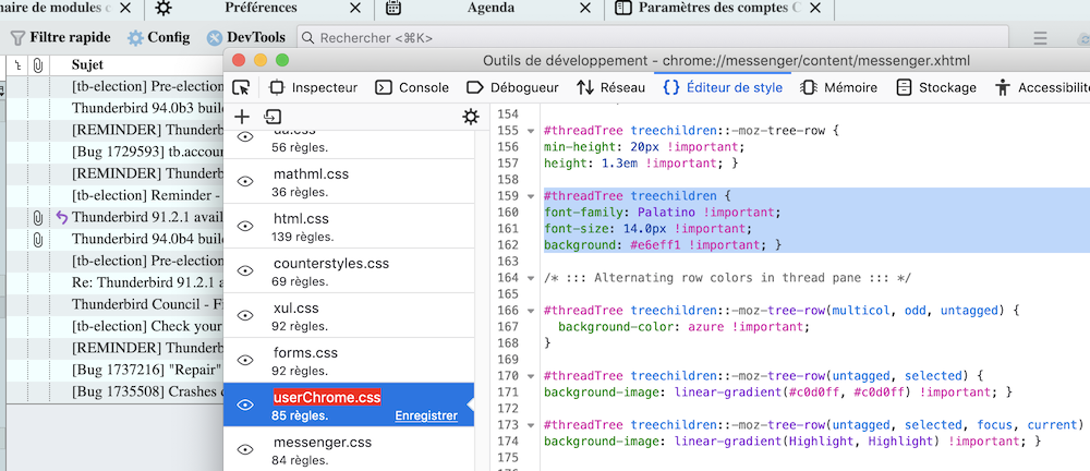 Dein CSS-Code für die Schriftgröße in der Nachrichtenliste funktioniert. Ich selber benutze (allerdings mit Palatino als Schriftart)