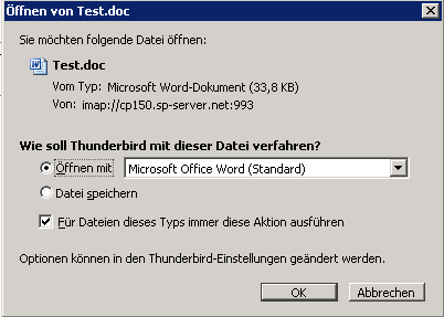 seit dem letzten Update auf TB 91.2.1 fragt TB stets, wie es mit der angehängten Word-Datei verfahren soll, obwohl ich das Standardprogramm ausgewählt habe. Außerdem ist "Für Dateien dieses Typs immer diese Aktion ausführen" angehakt. Das Abfragefenster erscheint nur bei Word-Dateien. Es nervt und bremst den Arbeitsfluss. Wie kann ich das Fenster verhindern?