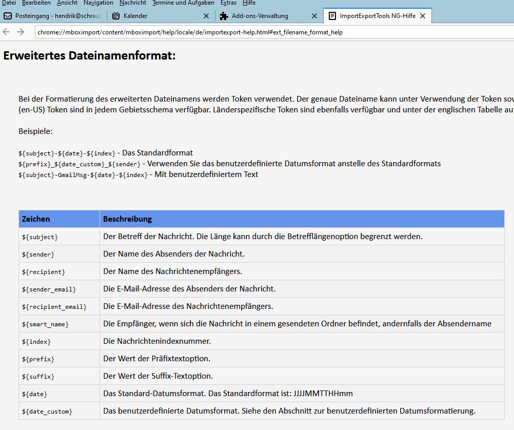 seit Update auf 91.2 wird beim Speichern von Mails (als .eml auf einen externen Speicherort) ein Dateiname vorgeschlagen, der Absender, Datum und Zeit enthält (Schema: Betreff - Absender - Datum Zeit).