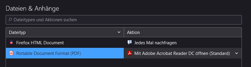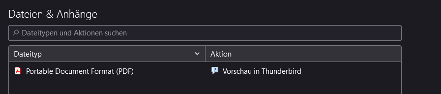 Jedenfalls bildet die handlers.json mit aktuellem Datum von heute aus meinem Thunderbird-Profil nicht die unter Einstellung > Dateien & Anhänge eingetragenen Punkte ab. Wie dem auch sei, man kann es ja mal probieren und eine vorhandene handlers.json testweise aus dem Profil entfernen und dann mal schauen, ob die sich neu generiert.