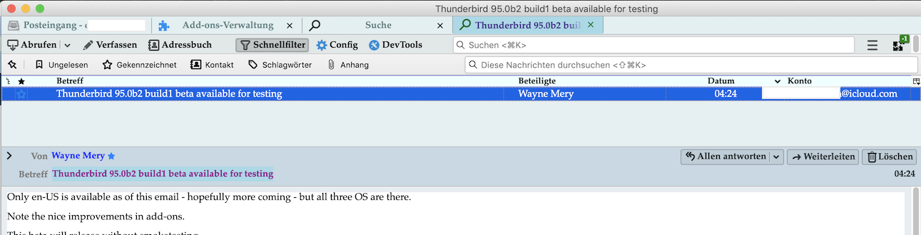 Heute habe ich die originale Email über die Suchfunktion in Thunderbird gesucht und auch gefunden. Hier wurde mir die originale Email und vier weitere (der Dialog zwischen mir und meinem Kollegen) als Vorschau angezeigt. In Summe werden mir dort also alle 5 Emails angezeigt. Wenn ich nun auf "Ergebnisse als Liste anzeigen" klicke, damit ich den Ort der originalen Email einsehen kann, sind in der angezeigten Liste nur noch 4 Emails. Das Original fehlt, obwohl es vorher in der Suchfunktion angezeigt wurde.