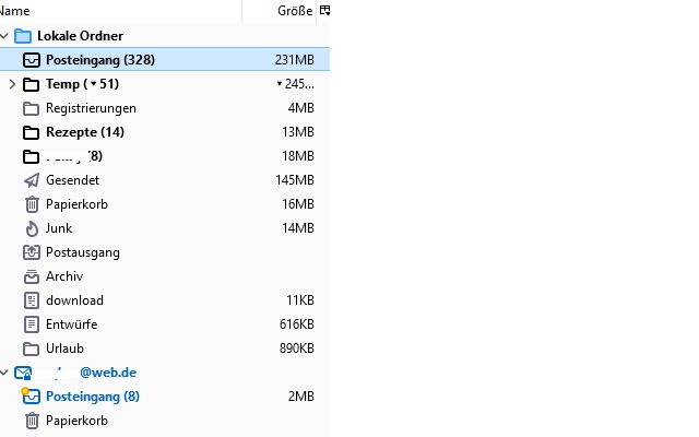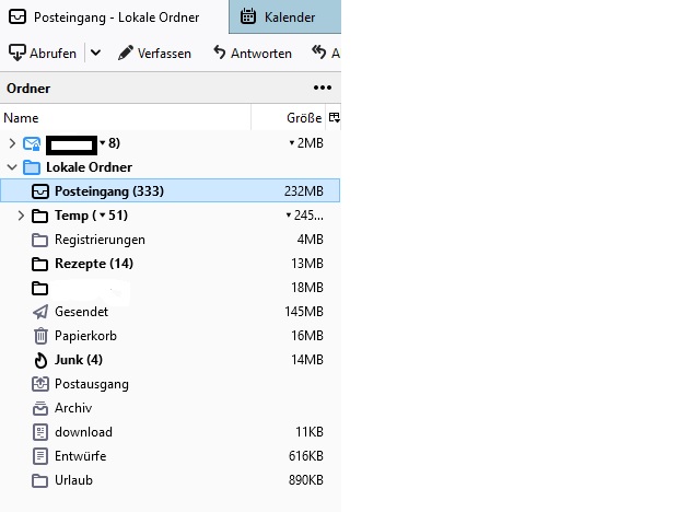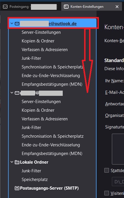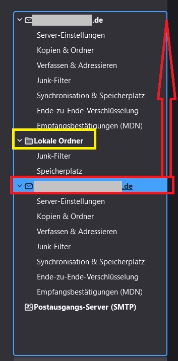 Das Konto wird gaaanz unten in meiner Ordnerleiste angezeigt. Ich hätte es gern dort wo die anderen Konten auch sind. Die wiederum finde ich nicht explizit in der Ordnerleiste, nur bei Abrufen kann ich sie im Dropdown finden. Das neue Konto steht komplett für sich alleine und das ganz unten und hat einen eigenen Posteingang und einen Papierkorb