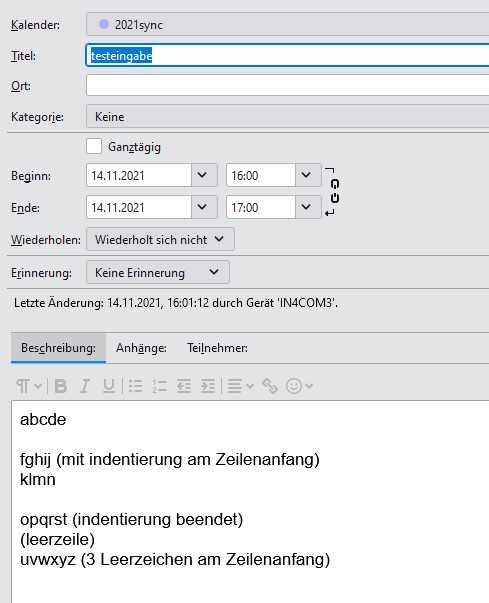 3. Schritt: wieder öffnen am PC - Kalendereintrag scheint keine Formierungen mehr zu haben - > Formatangaben werden nicht angezeigt.