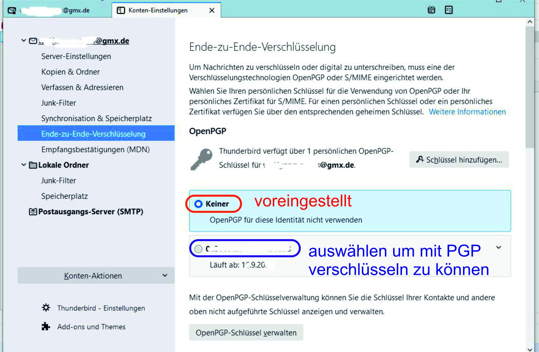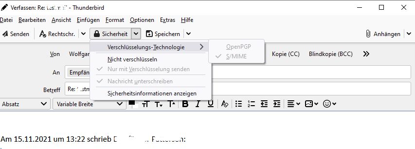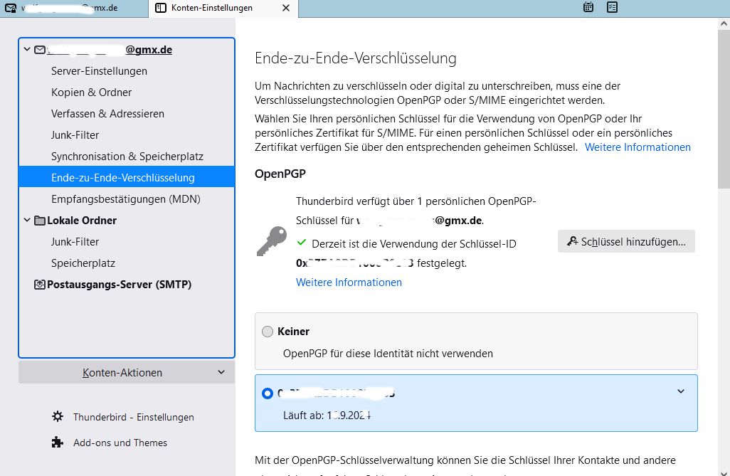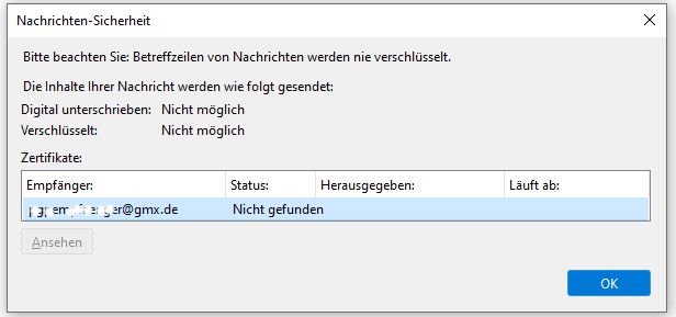Ankommende Mails werden entschlüsselt. Leider kann ich jedoch meine Mails nicht verschlüsseln. Die entprechenden Einstellungen sind gegraut (Bild 1). Der Key des Mailemfpängers wird nicht gefunden (Bild 2) obwohl sie in der Keyverwaltug angezeigt werden (Bild 3: Eintrag 1 und 2 sind die öfffentlichen Keys derer denen ich eine Mail senden möchte, der dritte Eintrag ist mein eigner Key).