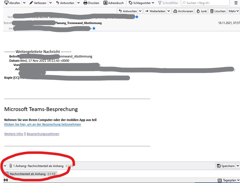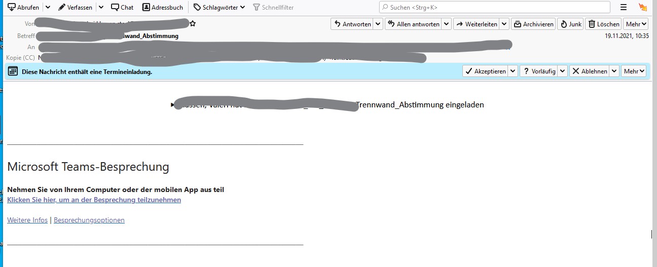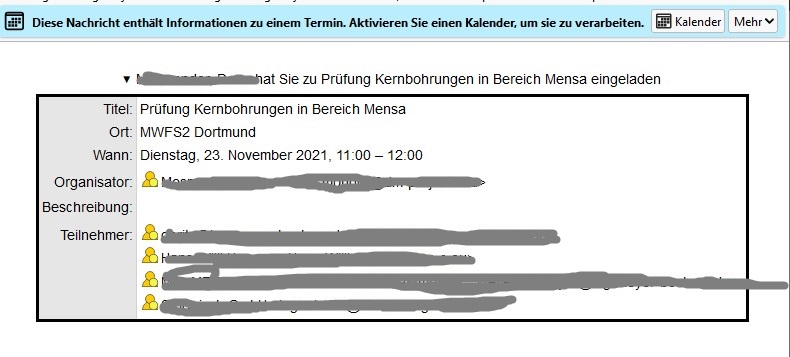 Wenn ich diese Mail mit einem anderen e-Mail-Clienten öffne, sind diese Informationen aber sichtbar.Diese Einladungen enthalten auch eine ics-Datei, die jedoch bei Thunderbir nicht als Anhang angezeigt werden, sondern lediglich in den Kalender importiert werden.