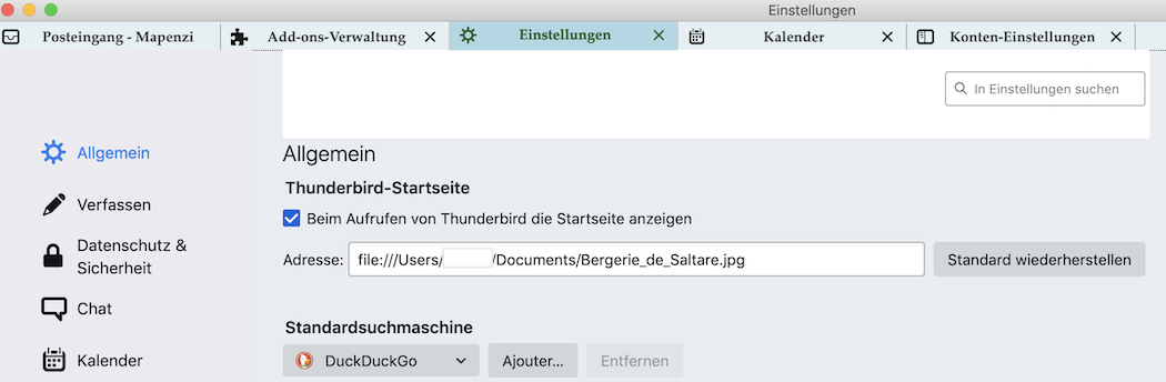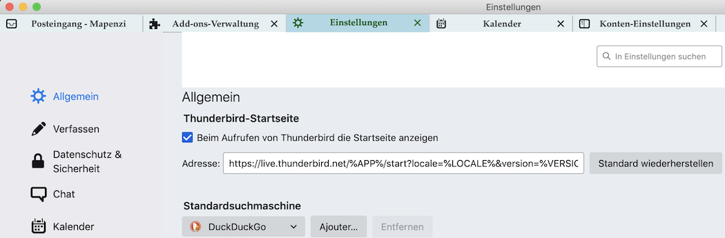 Danke für den schnellen Tipp. Leider funktioniert das mit Allgemein nicht. Allgemein lässt sich nicht anklicken um zu Thunderbird-Startseite zu kommen. Beim ersten anklicken von Einstellungen komme ich jedes mal auch Chat. Wenn ich danach Allgemein anklicke bricht nach einer geraumen Zeit Thunderbird ab. Grüßle Herbert