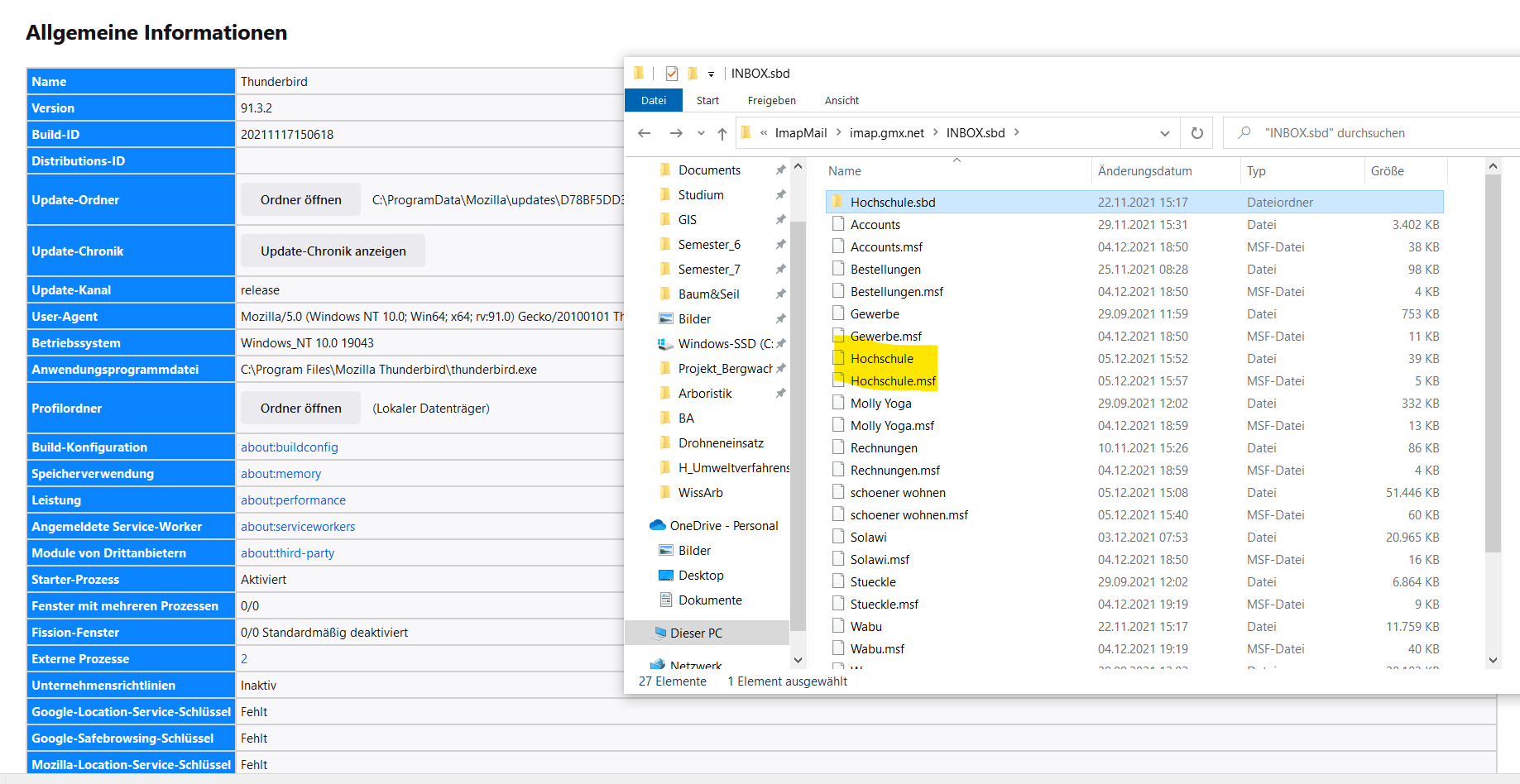 Was mir in den Ordnern aufgefallen ist (siehe Anhang), dass gestern (als noch keine neuen Mails da waren), einer der beiden gelb markierten Dateien nicht da war, sondern nur eine Datei mit ber Bezeichnug Hochschule.