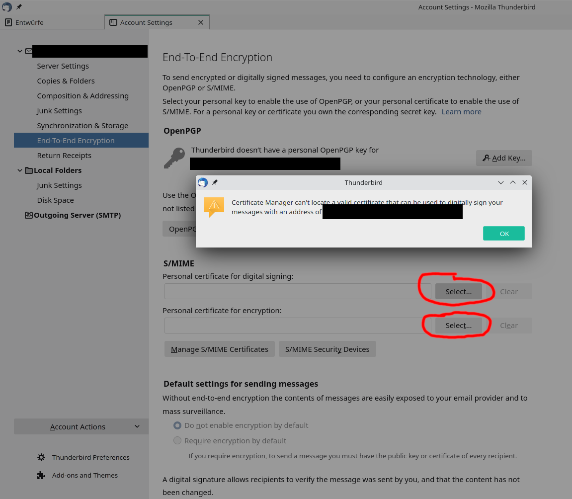 Wenn ich aber dann wieder zurückgehe und auf "Personal certificate for (digital singning/encryption): Select" gehe, wirft er einen Fehler: