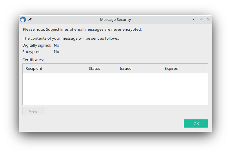 Komisch. Ich habe trotzdem versucht eine neue Mail zu schreiben und bin dort auf den Tab "Security" gegangen. Alles bis auf "Do not encrypt" ausgegraut. Kann nichts auswählen. Dabei müsste ich ja meine Mail zumindest signieren können (fürs Verschlüsseln brauche ich natürlich den public key vom Anderen). Gehe ich bei Security ganz unten auf Info, erhalte ich folgendes Fenster (ich bin immer noch in der neuen Mail anlegen Rubrik):