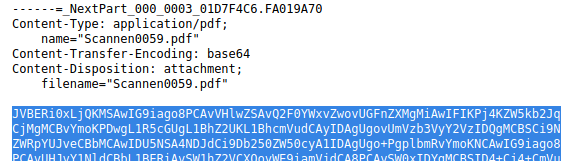 Wenn ich das richtig verstehe, befindet sich im letzten Abschnitt zwischen den Zeilen `------=_NextPart_000_0003_01D7F4C6.FA019A70--` codiert der Anhang, um den es in der Mail geht.