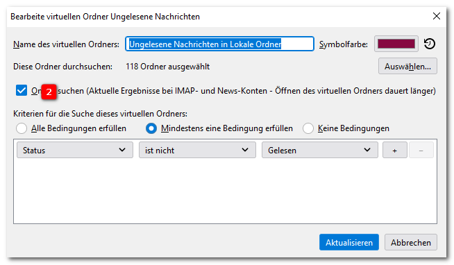 Der virt. Ordner wurde wie folgt erstellt. Die Option bei (2) habe ich sowohl aktiviert als auch deaktiviert ohne Verbesserung im Verhalten.